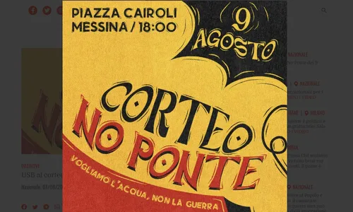 Contropiano - Saturday, August 2, 2025USB parteciperà al Corteo No Ponte, che il 9 agosto attraverserà le strade di Messina. Quest’anno più che mai l’appuntamento contro il cosiddetto progetto di costruzione della mega opera deve vederci numerosi e determinati. Lo scenario di guerra e di sterminio nel quale siamo immersi ci parla di un modello […]