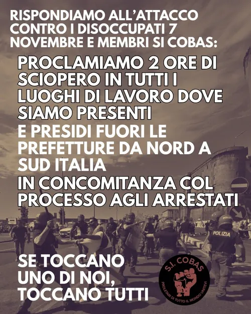 La scrivente O.S., in seguito ai gravi fatti repressivi accaduti nella mattina odierna presso la città di Napoli, che hanno portato all’arresto di tre militanti sindacali e al ferimento di numerosi manifestanti del “movimento disoccupati 7 Novembre” proclama con la presente, per la giornata dell’11 Luglio 2025, lo stato d’agitazione e sciopero dei lavoratori delle aziende della Provincia di Milano.