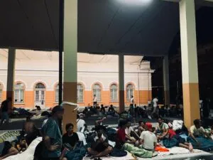 Da notare che, anche in questo caso, non si tratta di migranti in transito, ma: o di persone che hanno già i documenti e che avrebbero diritto all’accoglienza nel Centro di prima Accoglienza, che è invece stracolmo; o di persone che, presentatesi in Questura per fare domanda, vengono rimandate indietro di giorno in giorno.