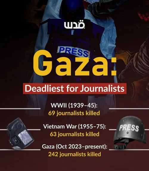 Durante la Seconda Guerra Mondiale, 69 giornalisti furono uccisi e 63 giornalisti morirono nella Guerra del Vietnam. A Gaza, il bilancio delle vittime ha raggiunto quota 242, incluso il recente assassinio della troupe di Al Jazeera, tra cui Anas Al-Sharif e Mohammad Qreiqea.