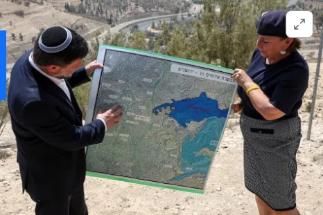 Il ministro delle Finanze israeliano Bezalel Smotrich e una donna mostrano una mappa che illustra il progetto di insediamento E1, da tempo congelato, che dividerebbe Gerusalemme Est dalla Cisgiordania occupata, durante una conferenza stampa vicino all’insediamento israeliano di Maale Adumim, nella Cisgiordania occupata. 14 agosto 2025. REUTERS/Ronen ZvulunMAALE ADUMIM, Cisgiordania/TEL AVIV- Il ministro delle Finanze israeliano di estrema destra Bezalel Smotrich ha annunciato l’avvio dei lavori per un insediamento a lungo rinviato che dividerebbe la Cisgiordania e la separerebbe da Gerusalemme Est, una mossa che secondo il suo ufficio “seppellirebbe” l’idea di uno stato palestinese.