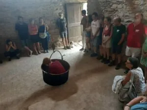 L’incontro, Parole per Gaza, inizia con una lettura itinerante, corale e coreografica del libro Vendesi Croce di Muin Masri. Le parole, a tratti macigni sul cuore, a tratti balsamo per le ferite, ci lasciano in silenzi densi che spezziamo con i passi, ora salendo in cima a una collina, aprendoci alla vista delle montagne, ora stringendoci nelle sale pietrose della Trappa. Ha un che di rituale, di artistico, di umano, camminare e ascoltare così, insieme. Le emozioni, solitamente tenute a bada per potersi occupare delle cose di tutti i giorni, tornano a fluire. Mentre il velo che normalmente le copre si assottiglia, per un attimo il mio pensiero va al libro Hospicing Modernity di Vanessa Machado de Oliveira, che molto parla dell’importanza di ricostruire la nostra capacità di stare a contatto con i problemi, di sostenere il dolore senza dissociarci, scappare via, impazzire. Non è cosa da poco, mi dico, anzi, come scrive l’antropologa Stefania Consigliere «Quando la struttura profonda di un mondo costruito sulla violenza si mostra senza orpelli, c’è da restare inebetite”. Di recente un uomo di grande intelligenza e sensibilità ci diceva che, se all’improvviso tutti i cittadini del primo mondo avvertissero la violenza, lo sfruttamento e la crudeltà che fondano e che rendono possibile il nostro mondo, non potrebbero resistere all’impatto.»