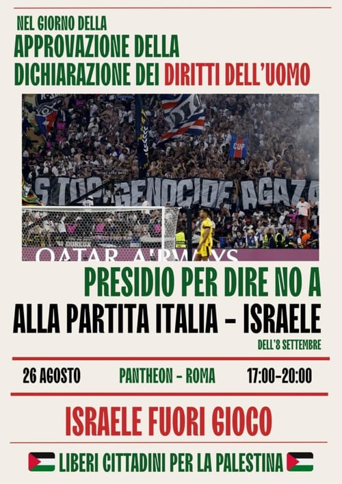 Martedì 26 agosto, ore 17:00 – 20:00 in Piazza del Pantheon a Roma: Presidio per dire NO alla partita Italia – Israele.