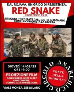 CIRCOLO ANARCHICO "PONTE DELLA GHISOLFA" - Tuesday, August 12, 2025Red Snake proiezione giovedì 14 agosto alle 19:00 Circolo Anarchico Ponte della Ghisolfa Viale Monza, 255 Milano …. Le donne sono sfruttate per soddisfare gli appetiti sessuali dei combattenti jihadisti tra i quali primeggia un foreign fighter, Al Britani, che … Continua a leggere→