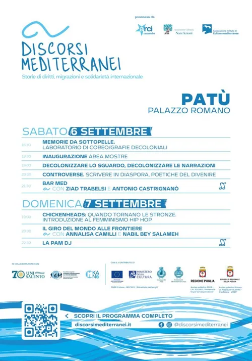 Progetto Melting Pot Europa - Wednesday, September 3, 2025Il 6 e 7 settembre Palazzo Romano a Patù ospiterà Discorsi Mediterranei, un festival itinerante – e giunto quest’anno alla sua 11a edizione – che adotta un approccio intersezionale attento ai legami tra diritti, identità sociali, questioni di genere, contesto ambientale e fenomeni migratori e si concentra sulle nuove narrazioni delle migrazioni.