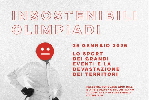 Ad un anno dalla cerimonia inaugurale delle Olimpiadi invernali di Milano-Cortina 2026 che avanzano divorando territori e risorse pubbliche, e a due settimane dalla giornata di mobilitazione nazionale La montagna non si arrende, sabato 25 gennaio al Circolo Arci Guernelli, Ape Bologna insieme alla Palestra Popolare Gino Milli incontrano il Comitato Insostenibili Olimpiadi e Ape Milano in una serata dedicata a sport popolare e territorio.