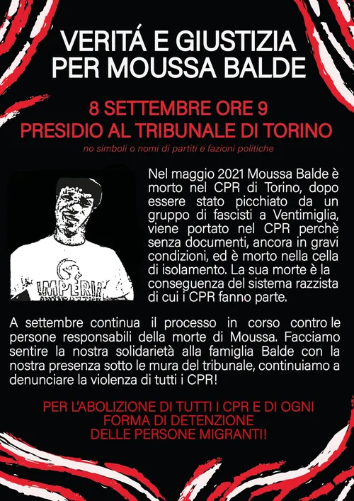 Radio Blackout - Info - Tuesday, September 9, 2025Moussa Balde era un amico e un compagno. Lo hanno trovato morto in una cella del CPR di Torino la notte tra il 22 e il 23 maggio 2021, dopo dieci giorni passati in isolamento. Dieci giorni in cui la direzione del CPR negava la sua presenza all’interno della struttura agli avvocati che lo stavano […]