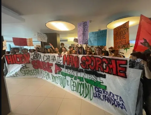 “Hilton ospita chi ha le mani sporche del sangue palestinese“, recita la scritta sul grande striscione srotolato all’interno dell’ingresso dell’albergo in cui attiviste e attiviste hanno presenziato per circa un’ora.
