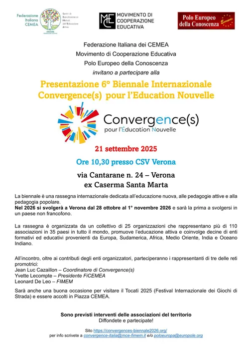 Movimento di Cooperazione Educativa - Monday, September 15, 2025Federazione Italiana dei CEMEA Movimento di Cooperazione Educativa Polo Europeo della Conoscenza invitano a partecipare alla Presentazione della 6° Biennale 21 settembre 2025 Ore 10,30 presso CSV Verona via Cantarane […]
