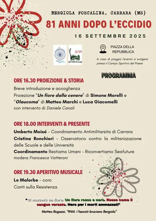 A 81 anni dalla strage nazifascista di Bergiola Foscalina (Carrara), nella giornata dedicata alla sua memoria, il Collettivo Giovane Bergiola e la Pro Loco organizzano un incontro a cui è invitato anche l’Osservatorio contro la militarizzazione delle scuole e delle università: un’iniziativa comunitaria dal basso, non istituzionale, per esercitare il dovere della memoria, prestando attenzione a cosa e come ricordiamo.