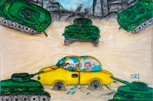 Una selezione di 40 disegni di bambini e ragazzi dai 3 ai 17 anni realizzati nella “Tenda degli Artisti” allestita da Mohammed Timraz a Deir al Balah, nel cuore della Striscia di Gaza, che raccontano con forza, purezza e creatività le difficoltà e i sogni di un’infanzia rubata.