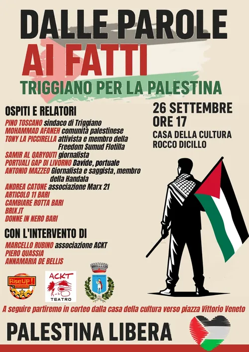 Il 26 settembre alle ore 17, presso la Casa della Cultura Rocco Dicillo di #Triggiano, si terrà l’iniziativa pubblica “Dalle parole ai fatti – Triggiano per la #Palestina”, organizzata da RiseUp!