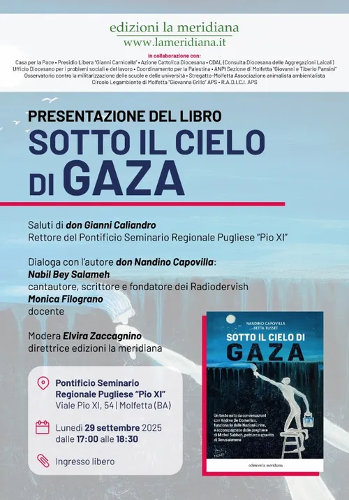 Alle 19.00 don Nandino Capovilla sarà a Bisceglie, presso l’Auditorium “Don Pierino Arcieri” EPASS odv, dove dialogherà con Jean Patrick Sablot, regista ed ebreo errante, e Azmi Jarjawi della comunità palestinese di Puglia e Basilicata, modererà l’incontro Rosa Siciliano, direttrice Mosaico di Pace. L’incontro, voluto per sensibilizzare sull’orrore che si compie in Palestina a causa del genocidio in atto, e sull’attenzione da riservare all’azione nonviolenza della Global Sumud Flotilla, con le sue 50 imbarcazioni dirette a Gaza per portare aiuti umanitari alla popolazione palestinese, è stato organizzato dal Punto Pace di Pax Christi di Bisceglie, in collaborazione con Anpi sezione “Michele D’Addato”, Arci sezione “Oltre i confini”, Auser Bisceglie, Caritas zona pastorale di Bisceglie, Cobas Puglia, E.p.a.s.s. odv, ass. di volontariato Don Pierino Arcieri, Servo per Amore Onlus, Meic, Osservatorio contro la militarizzazione delle scuole e delle università.