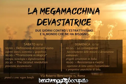 All’interno della due giorni pensiamo sia quindi importante partire da un excursus storico ed economico sul concetto di estrattivismo, per riconoscerne il ruolo fondamentale per la sopravvivenza del dominio. Passeremo poi alle contraddizioni della “transizione ecologica”, energetica e tecnologica/digitale. Discuteremo dell’impatto ambientale, politico e sociale delle imprese estrattiviste e delle sue altre evidenti conseguenze, quali la militarizzazione dei territori, la repressione e le guerre per le risorse. Ci concentreremo poi su degli esempi di lotte e resistenze alle mire estrattiviste, per concludere poi con una riflessione su quali prospettive e modalità d’intervento, da anarchiche e anarchici, vorremmo avere nella lotta contro l’estrattivismo.