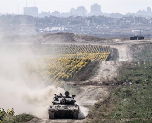 Un carro armato israeliano al confine settentrionale di Gaza, 28 maggio 2024. Fotografia: Mostafa Alkharouf/Anadolu/Getty Images