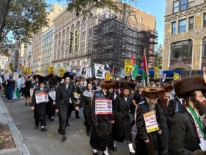La cosa sembra un po’ hollywoodiana, ma il mio cuore protesta e vuole crederci! A parlare insieme all’iman ci sono dei rabbini, che concordano con lui. Sono ebrei ortodossi, vestiti con pastrani neri, hanno i tipici riccioli e molti di loro portano il cappello di pelliccia, lo shtreimel. Per ora li intravedo appena, ma potrò osservarli bene durante il corteo, quando cammineranno in gruppo su diverse file, tenendosi per mano – tra loro ci sono anche bambini. I loro cartelli sono tra i più radicali contro Israele: bandiere con la stella di David bannata, rifiuto dello Stato d’Israele, sovranità dello Stato palestinese e sconvolgenti immagini di bambini uccisi dalla fame. Procederanno silenziosi e tranquilli, vestiti come fosse gennaio senza dare alcun segno di sofferenza – nemmeno da parte dei bambini.