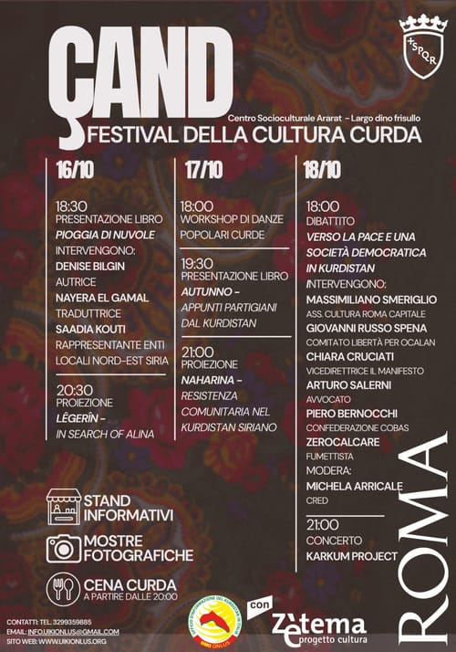 Retekurdistan.it - Tuesday, October 7, 2025Arriva “Çand”- festival della cultura curda. Dal 16 al 18 ottobre, al Centro Socio Culturale Ararat (largo Dino Frisullo). Tre giorni di musica, cinema, letteratura, danza, buon cibo e tutta la poesia del crepuscolo nel cuore di Testaccio.
