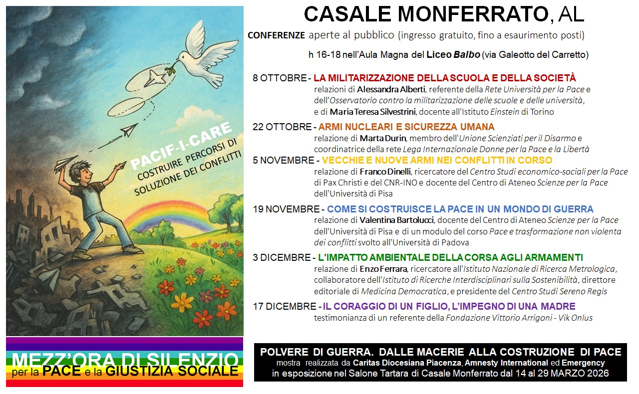 Pressenza - Tuesday, October 7, 2025Mercoledì 8 ottobre 2025 alle 16 nell’Aula Magna del Liceo Balbo di Casale Monferrato si svolgerà la prima di 6 conferenze tenute a cadenza quindicinale fino a dicembre 2025 e svolte nell’ambito del programma intitolato PACIF-I-CARE: costruire percorsi di soluzione dei conflitti.