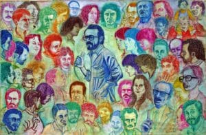 Un filo rosso collega tutte le opere di Manzella, che non critica fortemente solo i poteri costituiti ma anche quel regime del ventennio, rientrato con il Movimento Sociale Italiano e la sua fiamma tricolore (che Pino, in un suo disegno degli anni ’70, voleva spegnere con una “pisciata”), e poi con Alleanza Nazionale e poi ancora con questo governo vergognosamente composto da Fratelli d’Italia, berlusconiani, salviniani, vannacciani e frange dell’estrema destra neo-nazista.