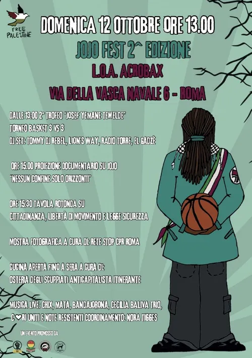 DINAMOpress - Friday, October 10, 2025L’energia e l’acuta intelligenza politica di Josef Yemane Tewelde, per tuttə semplicemente Jojo, continuano a circolare nelle strade e nei luoghi di lotta di Roma, a un anno e mezzo dalla sua prematura scomparsa. La testimonianza più concreta di questa eredità collettiva è la seconda edizione del JoJoFest, che si terrà il 12 ottobre presso il L.O.A. Acrobax in via della Vasca Navale 6. Una giornata di sport popolare, musica, socialità e riflessione politica organizzata da un’ampia rete di realtà sociali, collettivi, amicə e compagnə che con Jojo hanno condiviso percorsi di lotta e di vita.