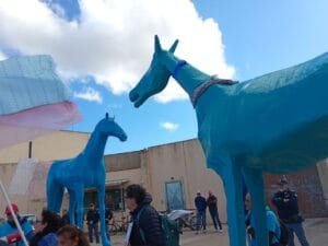 All’esterno, anche i due cavalli blu attendevano, incarnando il grido collettivo contro i luoghi di disumanizzazione e criminalizzazione dei migranti. Sono poi rientrati a Latiano, prima che nel pomeriggio un corteo animato e variegato in quanto a partecipazione si dispiegasse per le strade del centro di Brindisi, mescolando impegno civico, memoria storica ed espressione artistica.