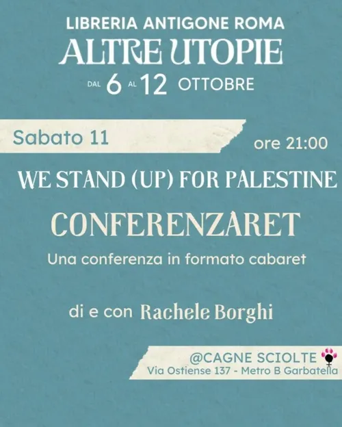 Sabato 11 ottobre – ore 20 – WE STAND (UP) WITH PALESTINE CONFERENZARET di e con Rachele Borghi, Festival Altre Utopie, Libreria Antigone @Cagne Sciolte
