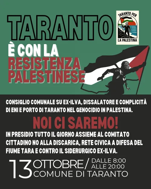 Radio Blackout - Info - Monday, October 13, 2025Presidio sotto il Comune di Taranto, questo lunedì 13 ottobre, dalle ore 08:00 alle 20:00 contro la complicità di Eni e del porto di Taranto con il genocidio palestinese, l’AIA e il dissalatore. In questa giornata, Taranto per la Palestina, insieme al comitato cittadino No discarica, rete civica A difesa del Fiume Tara e contro […]