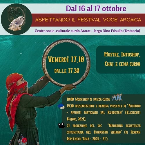- il 17 ottobre alle 18.00 Workshop di danza curda. Alle 19.30 presentazione e reading musicale di "Autunno - appunti partigiani dal Kurdistan" (Elementi Kairos, 2021). Alle 21 proiezione del doc "Naharina resistenza comunitaria nel Kurdistan siriano" (di Ferran Domènech Tona - 2025 - 51').