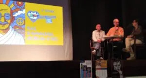 Il primo incontro, presentato da Carlo Bellisai, è stato con Olivier Turquet e il libro, a cura di Daniela Bezzi, Combattenti per la pace. Palestinesi e israeliani insieme per la liberazione collettiva, Multimage Edizioni, 2024, ormai giunto alla sesta ristampa. Olivier Turquet ne ha scritto la prefazione, ma è stato presente anche in veste di editore, in quanto coordina il gruppo editoriale dell’Associazione Multimage, la casa editrice dei diritti umani. Giornalista di Pressenza – Agenzia di stampa internazionale e scrittore che si occupa di nonviolenza. In primo momento ha raccontato come è nata l’idea del libro che raccoglie le testimonianze di uomini e donne palestinesi e israeliani/e del movimento Combatants for Peace, che — dopo anni di violenze e divisioni — decidono di incontrarsi, ascoltarsi e unirsi per promuovere insieme la pace.