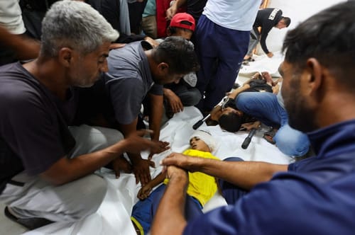 I palestinesi uccisi in un attacco israeliano vengono trasportati in barella all’ospedale Nasser di Khan Younis, nella Striscia di Gaza meridionale, il 19 ottobre 2025. REUTERS/Ramadan Abed