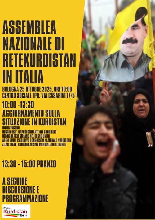 È in questo contesto che invitiamo tutte e tutti all’Assemblea nazionale di Rete Kurdistan in Italia, aperta a realtà organizzate, movimenti e singoli solidali con il popolo curdo. Sarà un momento per discutere insieme del nuovo scenario, delle responsabilità internazionali, del ruolo della solidarietà dal basso e delle prospettive per la costruzione di un Medio Oriente libero, democratico e giusto.