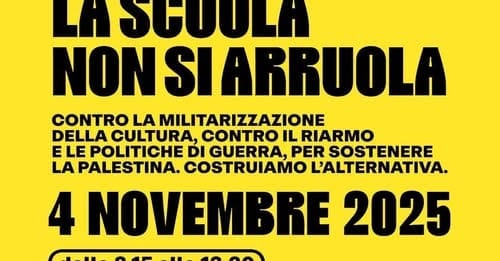 #lascuolavaallaguerra 4 novembre 2025: Convegno nazionale – formazione online “La #Scuola non si arruola” Il 4 novembre non è la nostra festa! Contro la #militarizzazione della cultura, contro il riarmo e le politiche di #guerra per sostenere la #Palestina https://osservatorionomilscuola.com/2025/10/21/4-novembre-2025-convegno-nazionale-formazione-online-scuola-arruola/