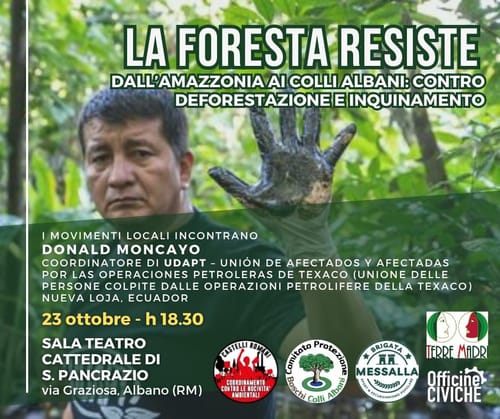 In comunicazione telefonica con Doris, del Comitato per la Protezione Boschi dei Colli Albani, abbiamo parlato di come sarà questo incontro ma anche di cosa si può imparare delle lotte per l'ambiente e contro il capitalismo che portano avanti i popoli del Sudamerica contro le grandi petroliere che devastano la foresta Amazzonica.