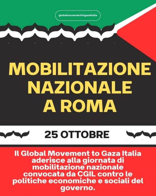 Il Global Movement to Gaza Italia aderisce alla giornata di mobilitazione nazionale del 25 ottobre, convocata da @cgilnazionale contro le politiche economiche e sociali del governo.