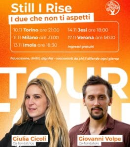 Pressenza - Monday, October 27, 2025Dopo anni trascorsi in prima linea tra crisi umanitarie, difesa dei diritti e costruzione di Scuole d’eccellenza nei contesti più complessi del mondo, dal 10 al 17 novembre 2025 Giulia Cicoli e Giovanni Volpe, co-fondatori di Still I Rise, portano in tour le loro storie e visioni in un ciclo di incontri pubblici dal titolo “Still I Rise: i due che non ti aspetti”. Gli eventi si terranno tra Torino, Milano, Imola, Jesi e Verona.