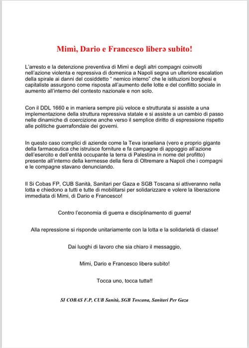 S.I. Cobas – Sindacato intercategoriale - Tuesday, October 28, 2025Il documento di solidarietà condiviso è unitario da noi S.I.Cobas FP, con Cub sanità, Sgb Toscana e sanitari per Gaza.