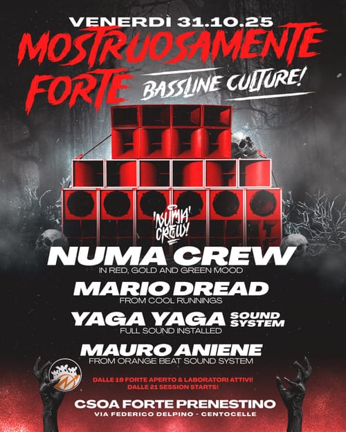 BASSLINE CULTURE EDITION: dopo aver ospitato ZION TRAIN, JAHTARI, DUB ENGINE, JAH VERSION, WEEDING DUB & SHANTI D, HEARTICAL SOUND & IRON DUBZ, per questa edizione avremo il piacere di avere con noi NUMA CREW, Florence Bassline Veteranz, che impreziosiranno la serata con una specialissima session in Red, Gold and Green Mood!