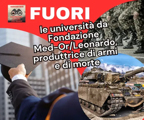 Osservatorio contro militarizzazione di scuole e università - Thursday, October 30, 2025Pubblichiamo la Lettera che come Osservatorio contro la militarizzazione delle scuole e delle università abbiamo inviato agli/alle otto Rettori/Rettrici delle università pubbliche che siedono ancora nel Consiglio di amministrazione della Fondazione Med-Or, legata a Leonardo SpA, azienda produttrice di armi esportate e vendute anche a Israele.