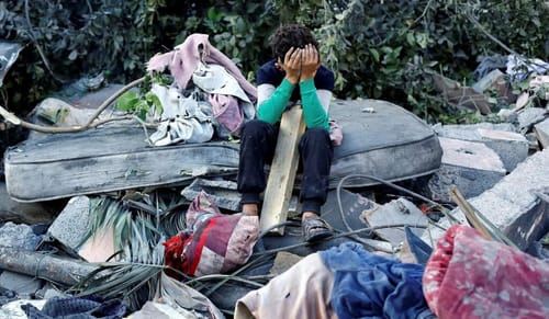 Un ragazzo palestinese seduto tra le macerie di una casa colpita durante la notte a Nuseirat, nella parte centrale di Gaza, mercoledì 29. Mahmoud Issa/ Reuters