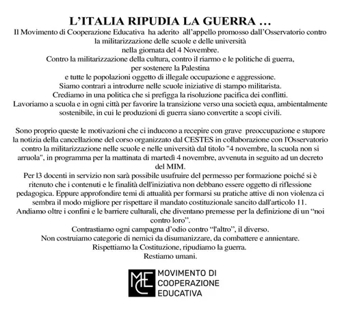 Riceviamo e pubblichiamo la nota con la quale il Movimento di Cooperazione Educativa (MCE) esprime solidarietà all’Osservatorio contro la militarizzazione delle scuole e delle università per l’annullamento del corso di formazione e aggiornamento dal titolo “La scuola non si arruola” da parte del Ministero dell’Istruzione e del Merito.