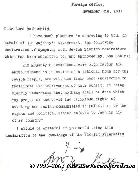 “Il governo di Sua Maestà vede con favore la costituzione in Palestina di un focolare nazionale per il popolo ebraico, e si adoprerà per facilitare il raggiungimento di questo scopo, essendo chiaro che nulla deve essere fatto che pregiudichi i diritti civili e religiosi delle comunità non ebraiche della Palestina, ne’ i diritti e lo status politico degli ebrei nelle altre nazioni”