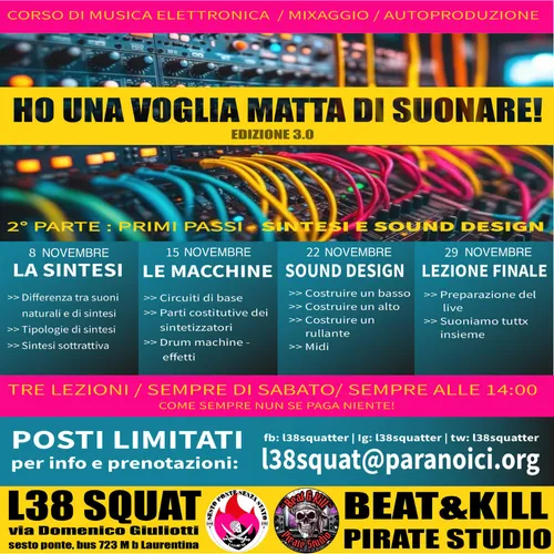 L38Squat - Monday, November 3, 2025Ho un voglia matta di suonare – Edizione 3.0 – Primi passi di sintesi e sound design Tre lezioni, sempre di sabato, sempre alle 14! 8 Novembre La sintesi 15 novembre Le macchine 22 novembre Sound design 29 novembre Lezione finale