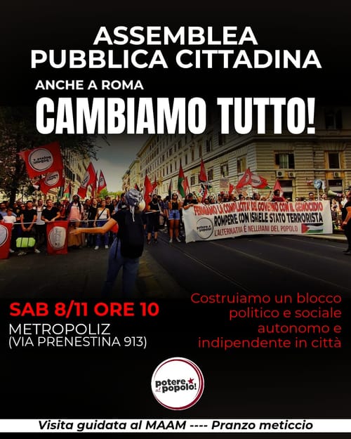 Contropiano - Monday, November 3, 2025ANCHE A ROMA CAMBIAMO TUTTO! ASSEMBLEA CITTADINA DI POTERE AL POPOLO Sabato 8 novembre ore 10 al Museo dell’Altro e dell’Altrove di Metropoliz, via Prenestina 913 Le grandi manifestazioni e scioperi delle scorse settimane a sostegno della Resistenza Palestinese all’insegna del “Blocchiamo Tutto”, hanno mostrato le straordinarie potenzialità di mobilitazione […]