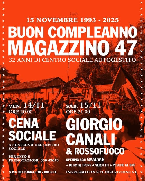 Venerdì 14 e sabato 15 novembre 2025 festeggiamo insieme in via Industriale, 10 a Brescia, il 32esimo compleanno del Magazzino 47, una storia collettiva fatta di lotte sociali e politiche, discussione, pensiero critico, autogestione, cultura e musica!