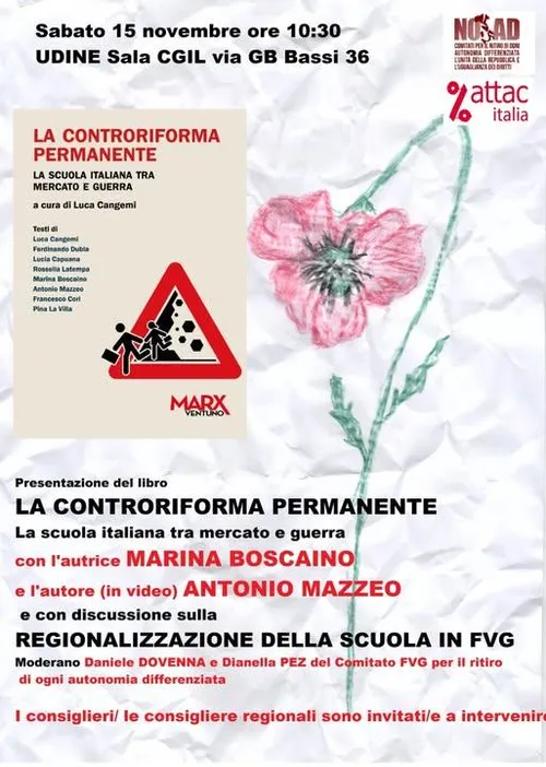 #Udine, sabato 15 novembre, ore 10.30 Presentazione del volume "La controriforma permanente. La #scuola italiana tra mercato e #guerra" (a cura di Luca Cangemi) - Con Marina Boscaino, Antonio Mazzeo, Daniele Dovenna, Dianella Pez.