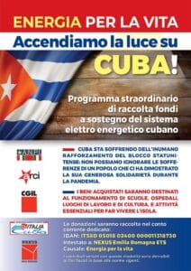 Cuba è da oltre sessant’anni vittima di un blocco economico che oggi, insieme alla crisi globale e ai disastri naturali, sta mettendo in ginocchio scuole, ospedali e luoghi di lavoro. Un popolo che ci ha dimostrato solidarietà nei momenti più difficili merita il nostro sostegno. Per questo CGIL Confederazione Generale Italiana del Lavoro, ANPI, Arci e Anaic promuovono la raccolta fondi “Energia per la vita”, destinata a sostenere il sistema elettro-energetico cubano attraverso l’acquisto di attrezzature e pannelli solari. Dona ora: IBAN: IT58D 05018 02400 000011318730 Intestato a: Nexus Emilia Romagna ETS Causale: Energia per la vita Ogni contributo è un gesto concreto di amicizia e speranza.