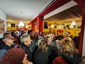 Questo l’antefatto. Certo il confronto tra la manifestazione degli antiputiniani doc che si è svolta nel tardo pomeriggio in centro e la serata a La Poderosa è impietoso: una sessantina mal contata contro un capiente salone stracolmo già un’ora prima dell’inizio della conferenza, tanto che gli organizzatori hanno dovuto predisporre sedie e impianto audio nel cortile e c’era parecchia gente ad ascoltare assiepata anche in strada.
