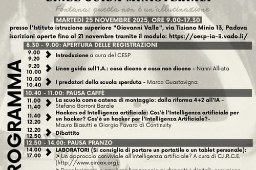 Martedì 25 novembre dalle 9.00 alle 17.30 a Padova si terrà un convegno laboratoriale di formazione sul tema dell'Intelligenza artificiale a scuola e di come viene imposta dalle linee ministeriali. Il convegno è organizzato da CESP (Centro Studi per la Scuola Pubblica) in collaborazione con CIRCE, Continuity, e il sindacato di base CUB.