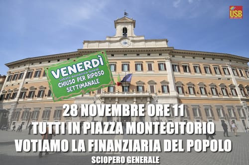 Contropiano - Monday, November 17, 2025Venerdì 28 novembre, in occasione dello sciopero generale, la manifestazione prevista per Roma sarà dalle ore 11.00 a Montecitorio. Nel giorno in cui i parlamentari non lavorano, come tutti i venerdì dell’anno, le lavoratrici e i lavoratori in sciopero votano e approvano la Finanziaria del popolo. Nel giorno dello sciopero […]