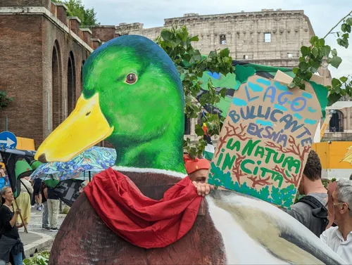 In questa data, deputata a richiamare l’attenzione globale sui temi ambientali e la crisi climatica il corteo, aperto da un gigantesco germano reale con al collo il fazzoletto rosso simbolo della lotta, ha lasciato il Lago salutato da oltre cento bambine e bambini delle scuole del territorio venute a consegnare nella forma di scritti, disegni e striscioni i loro messaggi rivolti al sindaco perché riconosca loro il diritto a godere della natura nel proprio quartiere, nel parco che accoglie l’unico lago naturale di Roma.